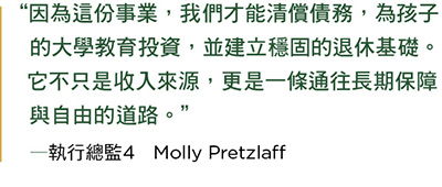 直到遇見美樂家,一切徹底改變。在最初的幾個月,她就能辭去其中一份兼職,不必再那麼拮据,甚至能偶爾買些過去總是不捨得買的小點心。隨著事業成長,她的獨立與自尊心也隨之提升。她能支付孩子的大學學費,還帶母親到豪華渡假村度過六天假期。