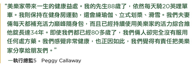 在老朋友、長期使用美樂家的 Bob 與 Genni Brown 的鼓勵下,Bobbi 開始補充美樂家的活力綜合維生素礦物質營養組合。