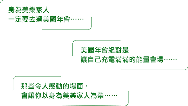 我在九年前去過美國年會,最大的收穫就是晉階,讓我從執行總監5一路晉階至執行總監9。會場內充滿極大的共振能量,所獲得的感動都自我激勵要不斷向前進。親眼見到許多美國優秀的高階領導人並與他們互動,也是非常深刻的體驗。能去美國年會真的是很棒的機會,大家一定要把握!