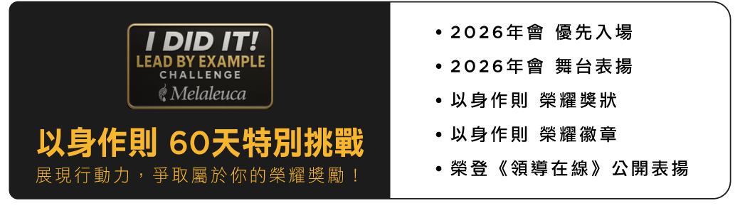2025年剩下最後一個月,用行動證明自己的領導力!專注於帶領團隊、實踐承諾,並創造影響力。特別是符合大堡礁遊輪之旅成行資格的領導人,快透過「以身作則 60天特別挑戰」,積極展現屬於你的領導力吧。持續衝刺、保持專注,領導團隊維持穩健的節奏,激勵夥伴在最後一哩路中奮力衝刺。請記住:現在的成功絕不是停下的理由,而是推動下次突破的燃料。在即將迎接2026年之際,用個人行動替團隊創下共同榮耀,為事業寫下承先啟後的光輝一頁!