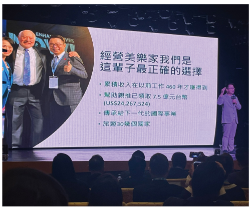 真正的領導力,同樣在於「持續行動」。當領導者以身作則、持續落實七要素,夥伴自然會受到正向的帶動影響,願意跟隨並讓自己的事業持續發展。當團隊中的大家都這麼做,組織就能齊步成長。如同企業總監3陳世榮在郵輪上為夥伴們進行課程訓練時所分享:即便目前個人累積收入,已是過去本業要工作460年才能達到的數字,但在他與姜桂花心中,幫助親推夥伴們領到的美樂家收入已累積達新台幣7.5億元,這個金額對他們來說更具意義。陳世榮更在簡報中用照片秀出10組親推夥伴,階銜從總監級到全國總監級都有;他強調:持續幫助夥伴一步步向上晉階,這樣的助人行動力就是讓他最快樂的事。