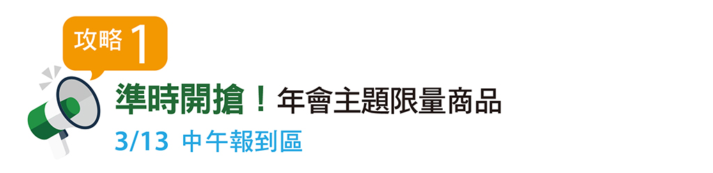 還記得去年的搶購盛況嗎?別忘記今年一樣在13日提前抵達會場,利用9點至9點40分這段時間,先至報到區旁的限量紀念商品展示區,看看今年推出的限量紀念品。預先填寫商品訂購單,等到當日中午開放購買時,可以節省排隊時間。從從容容、游刃有餘,優雅的計畫通就是你。
