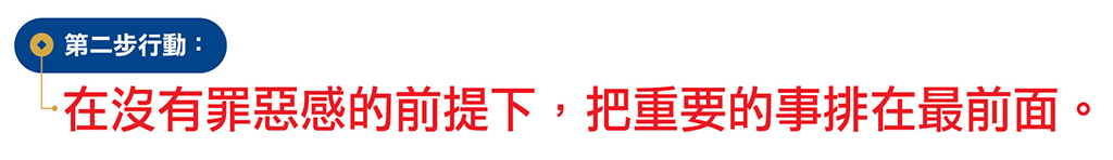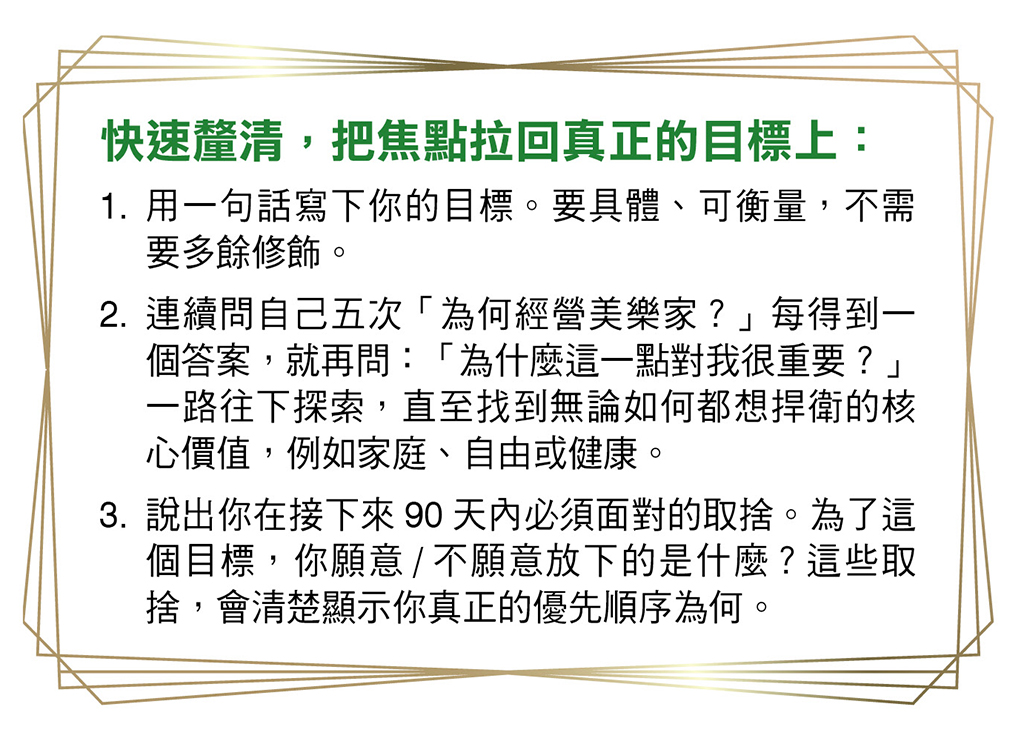 每90天,留半天給自己,好好停下來整理現況與方向。問自己:「我可以減輕哪些負擔?哪些真正重要的事該優先處理?哪些低價值活動該停止?哪些高效活動該開始?」這重要的半天,你正在經歷保留、放下、創造,好讓你未來能走得更輕盈、更迅速。