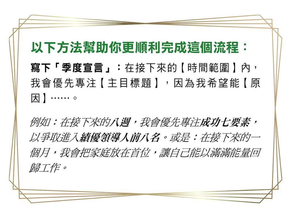 高效人士常常想同時兼顧所有事,結果卻覺得自己每一項都不夠好而陷入內疚。但這種內疚不是人格缺陷,而是來自根本不可能達成的標準。當你覺得力不從心時,真正的解方不是降低標準,而是採用更聰明的策略,從追求永遠的完美平衡,轉向依「季」調整的專注模式。創造屬於自己的事業季度、並為它命名;然後,讓你的行程完全對應它。