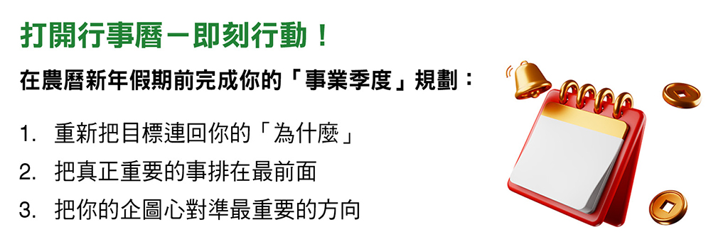 大多數的目標,都始於一個火花。可能是你期望帶來改變的一筆持續收入,或是一個你正努力追尋的事業里程碑。時間久了,這個火花很容易被日常瑣事淹沒,或被他人的期待掩蓋。你看似仍在前進,但最初的那火石電光已然熄滅。