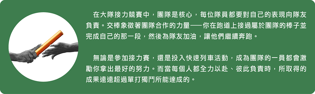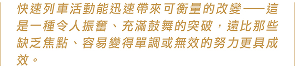 在一支成功的快速列車隊伍中,每位成員都在協調一致的努力下朝著自己的目標前進,人人都扮演著同等且重要的角色。當大家每天都全力以赴時,不僅能完成各自的目標,往往還能超越期待。