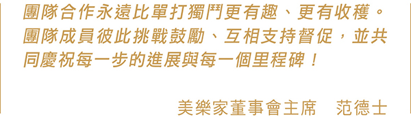 美樂家執行長范德士先生曾說:「加入團隊需要你做出具體而真誠的承諾,去採取必要的行動——這是一份不僅對自己,更是對團隊的承諾」,「團隊合作永遠比單打獨鬥更有趣、更有收穫。團隊成員彼此挑戰鼓勵、互相支持督促,並共同慶祝每一步的進展與每一個里程碑!」他更表示道:「那些專注於關鍵活動的團隊,將以比以往更快的速度拓展新顧客。這需要承諾、努力與付出,但回報絕對值得!」