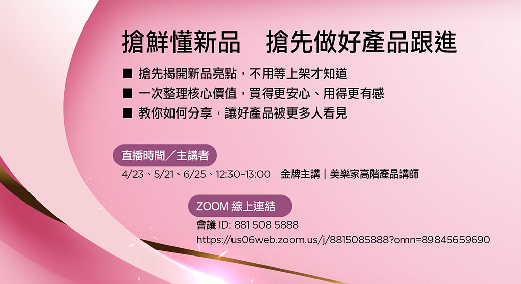 想搶先知道下個月的新品是什麼嗎?「新品搶鮮報」線上直播將於2026第二季正式啟動!不論你是想更了解新品的愛用會員,還是希望提升產品力的經營者,「新品搶鮮報」線上直播,讓你搶先掌握關鍵訊息,推薦分享更有利!
