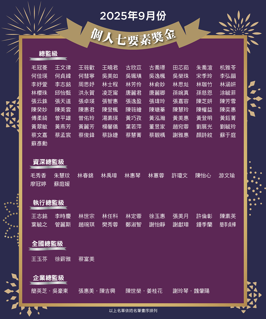 2025年9月份 個人七要素獎金榮譽榜